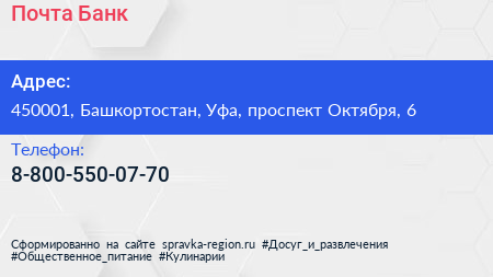 Почта Банк по адресу 450001, Башкортостан, Уфа, проспект Октября, 6 в дальнейшем Организация, размещена в следующих категориях: