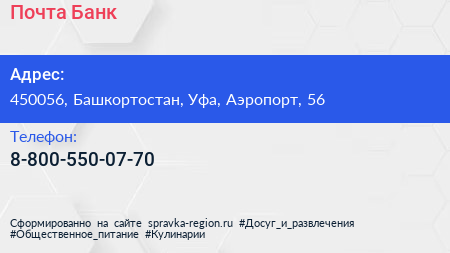 Почта Банк по адресу 450056, Башкортостан, Уфа, Аэропорт, 56 в дальнейшем Организация, размещена в следующих категориях: