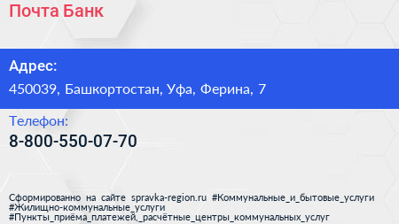 Почта Банк по адресу 450039, Башкортостан, Уфа, Ферина, 7 в дальнейшем Организация, размещена в следующих категориях: