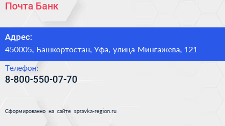 Почта Банк по адресу 450005, Башкортостан, Уфа, улица Мингажева, 121 в дальнейшем Организация, размещена в следующих категориях: