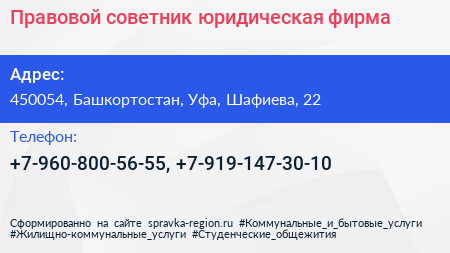 Правовой советник, юридическая фирма по адресу 450054, Башкортостан, Уфа, Шафиева, 22 в дальнейшем Организация, размещена в следующих категориях:
