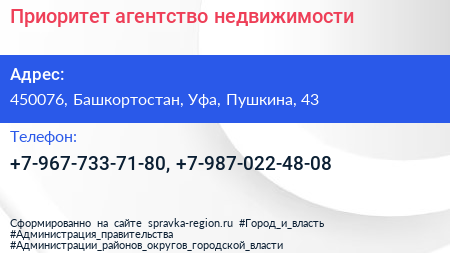 Приоритет, агентство недвижимости по адресу 450076, Башкортостан, Уфа, Пушкина, 43 в дальнейшем Организация, размещена в следующих категориях: