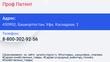 Проф Патент по адресу 450902, Башкортостан, Уфа, Каскадная, 1 в дальнейшем Организация, размещена в следующих категориях: