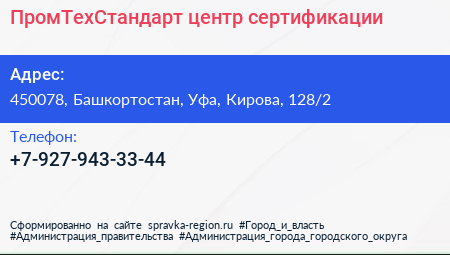 ПромТехСтандарт, центр сертификации по адресу 450078, Башкортостан, Уфа, Кирова, 128/2 в дальнейшем Организация, размещена в следующих категориях: