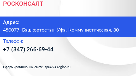 РОСКОНСАЛТ по адресу 450077, Башкортостан, Уфа, Коммунистическая, 80 в дальнейшем Организация, размещена в следующих категориях: