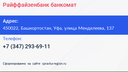 Райффайзенбанк, банкомат по адресу 450022, Башкортостан, Уфа, улица Менделеева, 137 в дальнейшем Организация, размещена в следующих категориях: