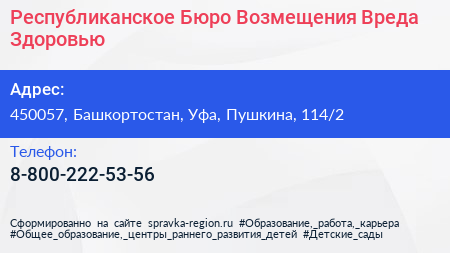 Республиканское Бюро Возмещения Вреда Здоровью по адресу 450057, Башкортостан, Уфа, Пушкина, 114/2 в дальнейшем Организация, размещена в следующих категориях: