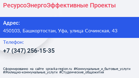 РесурсоЭнергоЭффективные Проекты по адресу 450103, Башкортостан, Уфа, улица Сочинская, 43 в дальнейшем Организация, размещена в следующих категориях: