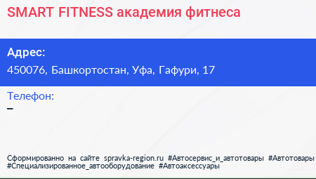 SMART FITNESS, академия фитнеса по адресу 450076, Башкортостан, Уфа, Гафури, 17 в дальнейшем Организация, размещена в следующих категориях: