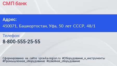 СМП банк по адресу 450071, Башкортостан, Уфа, 50 лет СССР, 48/1 в дальнейшем Организация, размещена в следующих категориях: