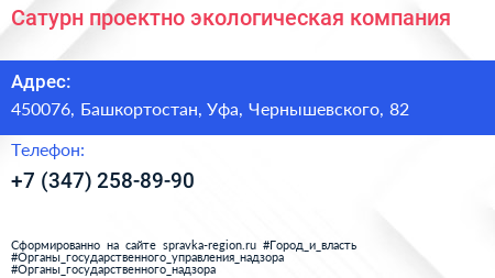 Сатурн, проектно-экологическая компания по адресу 450076, Башкортостан, Уфа, Чернышевского, 82 в дальнейшем Организация, размещена в следующих категориях: