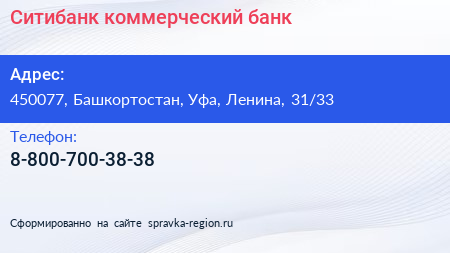 Ситибанк, коммерческий банк по адресу 450077, Башкортостан, Уфа, Ленина, 31/33 в дальнейшем Организация, размещена в следующих категориях: