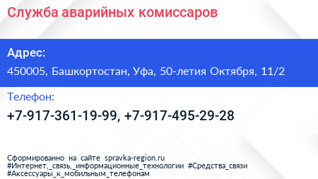 Служба аварийных комиссаров по адресу 450005, Башкортостан, Уфа, 50-летия Октября, 11/2 в дальнейшем Организация, размещена в следующих категориях: