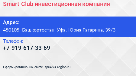 Smart Club, инвестиционная компания по адресу 450105, Башкортостан, Уфа, Юрия Гагарина, 39/3 в дальнейшем Организация, размещена в следующих категориях: