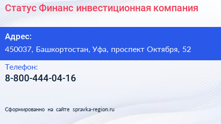 Статус Финанс, инвестиционная компания по адресу 450037, Башкортостан, Уфа, проспект Октября, 52 в дальнейшем Организация, размещена в следующих категориях: