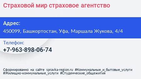 Страховой мир, страховое агентство по адресу 450099, Башкортостан, Уфа, Маршала Жукова, 4/4 в дальнейшем Организация, размещена в следующих категориях: