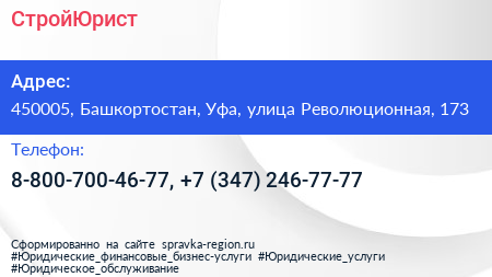 СтройЮрист по адресу 450005, Башкортостан, Уфа, улица Революционная, 173 в дальнейшем Организация, размещена в следующих категориях: