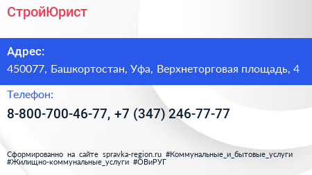 СтройЮрист по адресу 450077, Башкортостан, Уфа, Верхнеторговая площадь, 4 в дальнейшем Организация, размещена в следующих категориях: