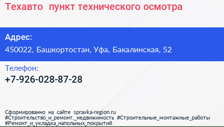 Техавто+, пункт технического осмотра по адресу 450022, Башкортостан, Уфа, Бакалинская, 52 в дальнейшем Организация, размещена в следующих категориях: