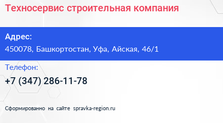 Техносервис, строительная компания по адресу 450078, Башкортостан, Уфа, Айская, 46/1 в дальнейшем Организация, размещена в следующих категориях: