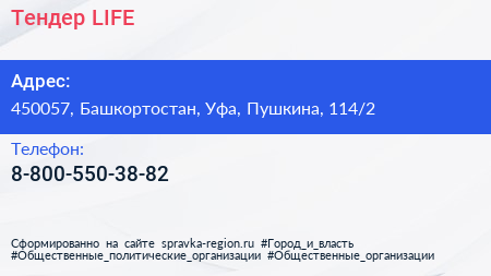 Тендер-LIFE по адресу 450057, Башкортостан, Уфа, Пушкина, 114/2 в дальнейшем Организация, размещена в следующих категориях: