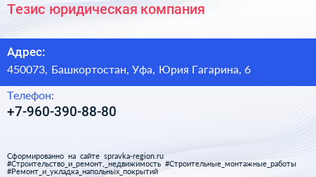 Тезис, юридическая компания по адресу 450073, Башкортостан, Уфа, Юрия Гагарина, 6 в дальнейшем Организация, размещена в следующих категориях:
