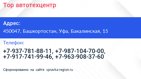 Тор, автотехцентр по адресу 450047, Башкортостан, Уфа, Бакалинская, 15 в дальнейшем Организация, размещена в следующих категориях: