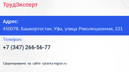 ТрудЭксперт по адресу 450078, Башкортостан, Уфа, улица Революционная, 221 в дальнейшем Организация, размещена в следующих категориях: