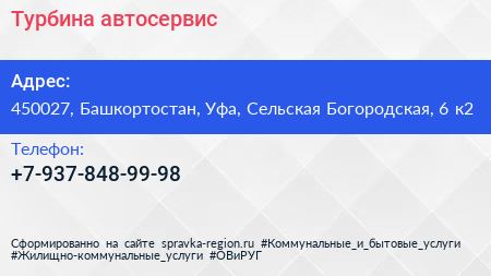 Турбина, автосервис по адресу 450027, Башкортостан, Уфа, Сельская Богородская, 6 к2 в дальнейшем Организация, размещена в следующих категориях:
