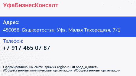 УфаБизнесКонсалт по адресу 450058, Башкортостан, Уфа, Малая Тихорецкая, 7/1 в дальнейшем Организация, размещена в следующих категориях: