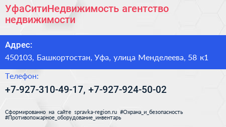 УфаСитиНедвижимость, агентство недвижимости по адресу 450103, Башкортостан, Уфа, улица Менделеева, 58 к1 в дальнейшем Организация, размещена в следующих категориях: