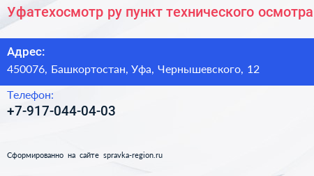 Уфатехосмотр.ру, пункт технического осмотра по адресу 450076, Башкортостан, Уфа, Чернышевского, 12 в дальнейшем Организация, размещена в следующих категориях: