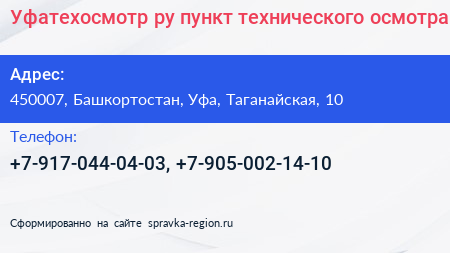 Уфатехосмотр.ру, пункт технического осмотра по адресу 450007, Башкортостан, Уфа, Таганайская, 10 в дальнейшем Организация, размещена в следующих категориях: