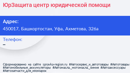 ЮрЗащита, центр юридической помощи по адресу 450017, Башкортостан, Уфа, Ахметова, 326а в дальнейшем Организация, размещена в следующих категориях:
