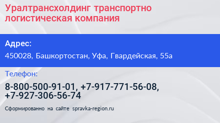 Уралтрансхолдинг, транспортно-логистическая компания по адресу 450028, Башкортостан, Уфа, Гвардейская, 55а в дальнейшем Организация, размещена в следующих категориях: