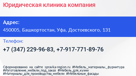Для связи с организацией воспользуйтесь номером телефона: +7 (347) 229-96-83, +7-917-771-89-76. Пн: c 09:30-11:30, Вт: выходной, Ср: c 09:30-11:30, Чт: выходной, Пт: выходной, Сб: выходной, Вс: выходной, вы можете обратиться в эту организацию.