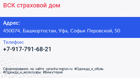 ВСК, страховой дом по адресу 450074, Башкортостан, Уфа, Софьи Перовской, 50 в дальнейшем Организация, размещена в следующих категориях: