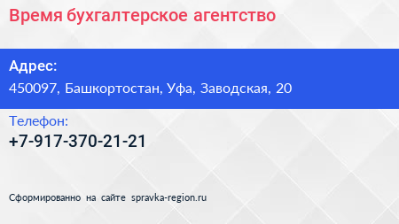 Время, бухгалтерское агентство по адресу 450097, Башкортостан, Уфа, Заводская, 20 в дальнейшем Организация, размещена в следующих категориях: