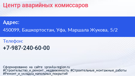 Центр аварийных комиссаров по адресу 450099, Башкортостан, Уфа, Маршала Жукова, 5/2 в дальнейшем Организация, размещена в следующих категориях: