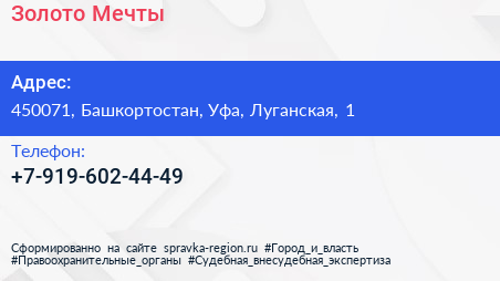 Золото Мечты по адресу 450071, Башкортостан, Уфа, Луганская, 1 в дальнейшем Организация, размещена в следующих категориях: