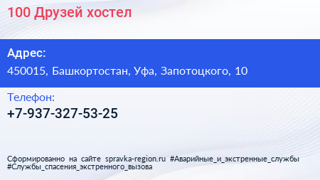 100 Друзей, хостел по адресу 450015, Башкортостан, Уфа, Запотоцкого, 10 в дальнейшем Организация, размещена в следующих категориях: