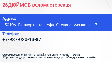 26ДЮЙМОВ, веломастерская по адресу 450106, Башкортостан, Уфа, Степана Кувыкина, 17 в дальнейшем Организация, размещена в следующих категориях: