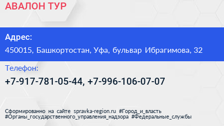 АВАЛОН-ТУР по адресу 450015, Башкортостан, Уфа, бульвар Ибрагимова, 32 в дальнейшем Организация, размещена в следующих категориях: