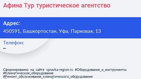 Афина Тур, туристическое агентство по адресу 450591, Башкортостан, Уфа, Парковая, 13 в дальнейшем Организация, размещена в следующих категориях: