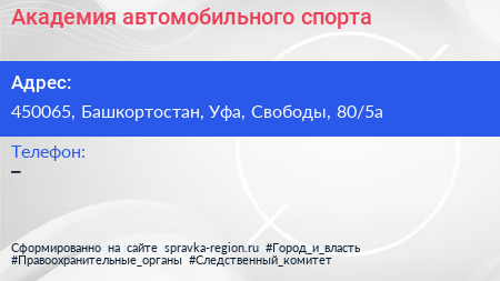 Академия автомобильного спорта по адресу 450065, Башкортостан, Уфа, Свободы, 80/5а в дальнейшем Организация, размещена в следующих категориях: