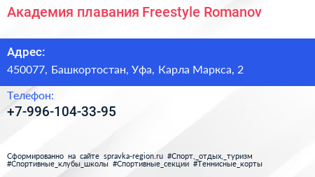 Академия плавания Freestyle Romanov по адресу 450077, Башкортостан, Уфа, Карла Маркса, 2 в дальнейшем Организация, размещена в следующих категориях: