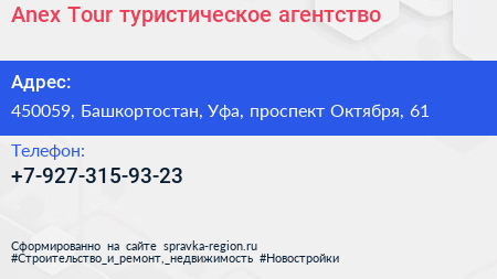 Anex Tour, туристическое агентство по адресу 450059, Башкортостан, Уфа, проспект Октября, 61 в дальнейшем Организация, размещена в следующих категориях: