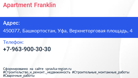 Apartment Franklin по адресу 450077, Башкортостан, Уфа, Верхнеторговая площадь, 4 в дальнейшем Организация, размещена в следующих категориях: