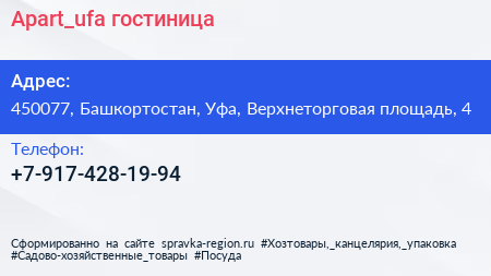 Apart_ufa, гостиница по адресу 450077, Башкортостан, Уфа, Верхнеторговая площадь, 4 в дальнейшем Организация, размещена в следующих категориях: