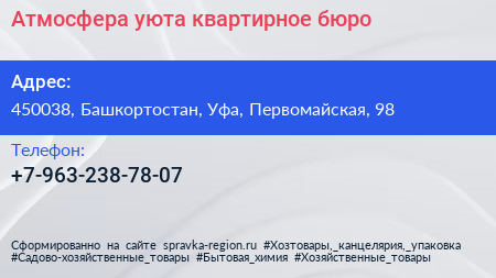 Атмосфера уюта, квартирное бюро по адресу 450038, Башкортостан, Уфа, Первомайская, 98 в дальнейшем Организация, размещена в следующих категориях: